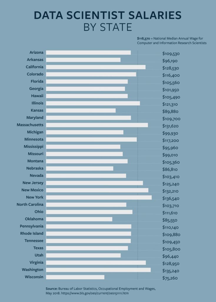 Go to a tabular version of data at the bottom of the page to view the median salary of data scientists by state.