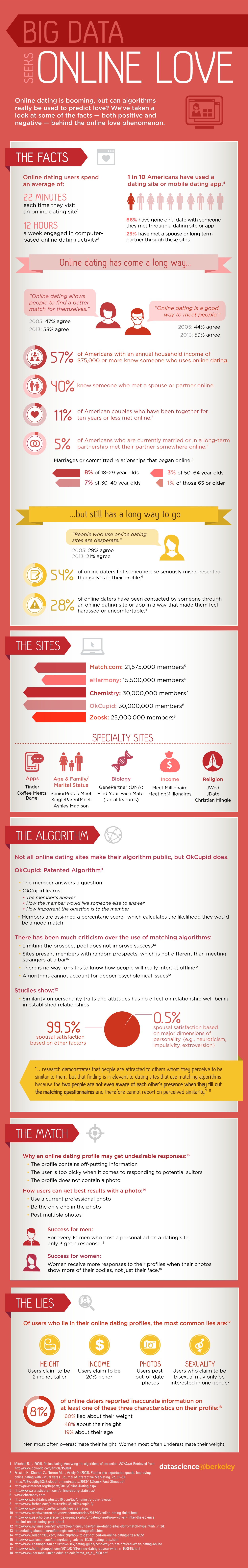 Online dating purports to combine both “data” and “science” to find you that perfect match. One in 10 Americans have used a dating site or mobile app, and 23 percent have met a spouse or long-term partner through these sites. In fact, 11 percent of American couples who have been together for 10 years or less met online. It’s no wonder—in addition to generic sites like Match.com, eHarmony, and OkCupid—the online dating world is rich with specialty sites for daters looking for a match based on a number of factors (e.g., income, biological traits, age, religion).