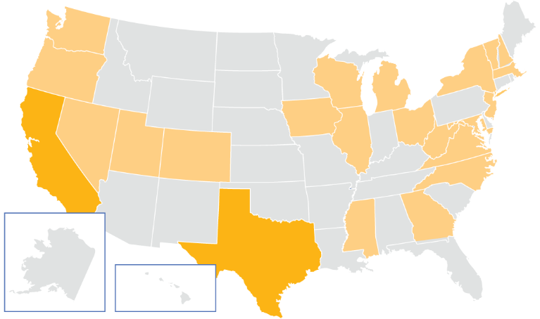 Map shows that MICS students are located in California, Colorado, Georgia, Illinois, Iowa, Maryland, Massachusetts, Michigan, Mississippi, Nevada, New Hampshire, New Jersey, New York, North Carolina, Ohio, Oregon, Texas, Utah, Vermont, Virginia, Washington, West Virginia, and Wisconsin. The highest concentration of students is in California, followed by Texas.